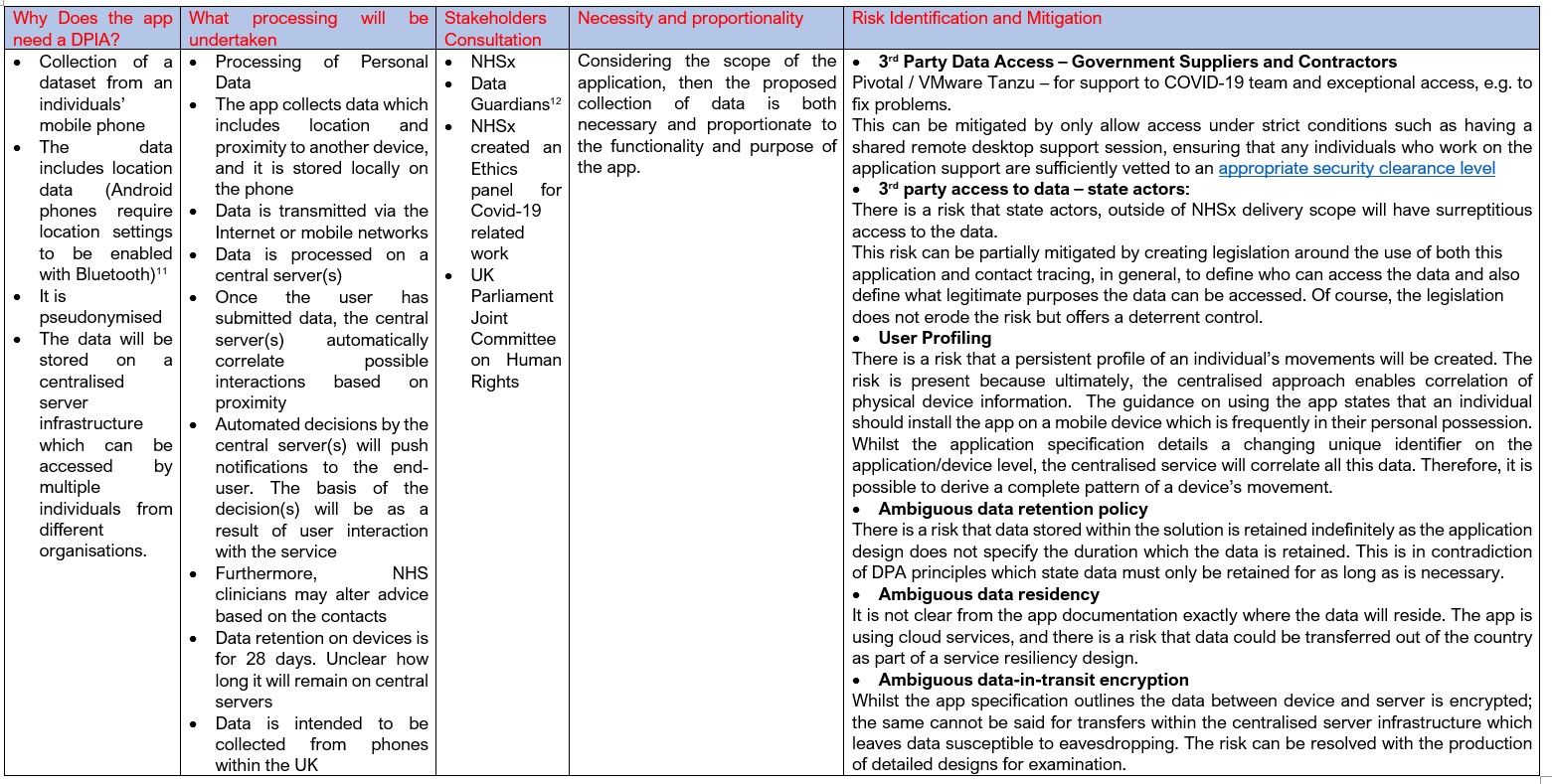 • There are numerous contradictory statements concerning the nature and classification of data. Matthew Gould, CEO NHSx[18] and Ian Levy[19] have said in independent reports that the application does not hold or generate any data which would be considered personal. However, this contradicts the NHSx DPIA for the application9