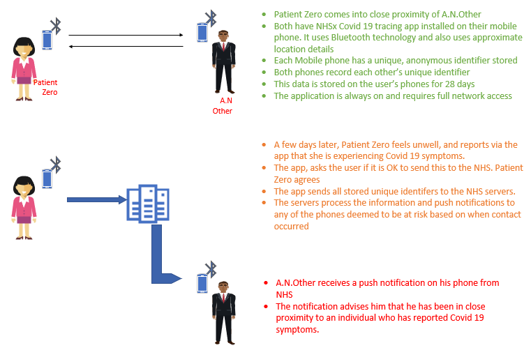 Contact tracing is a process where an individual voluntarily installs an application onto their mobile device. The application is designed to use the functions of the mobile such as Bluetooth and networking capability. The application aims to create a record of other devices which have been in proximity. The operation of the application is explained further in Figure 1 below.