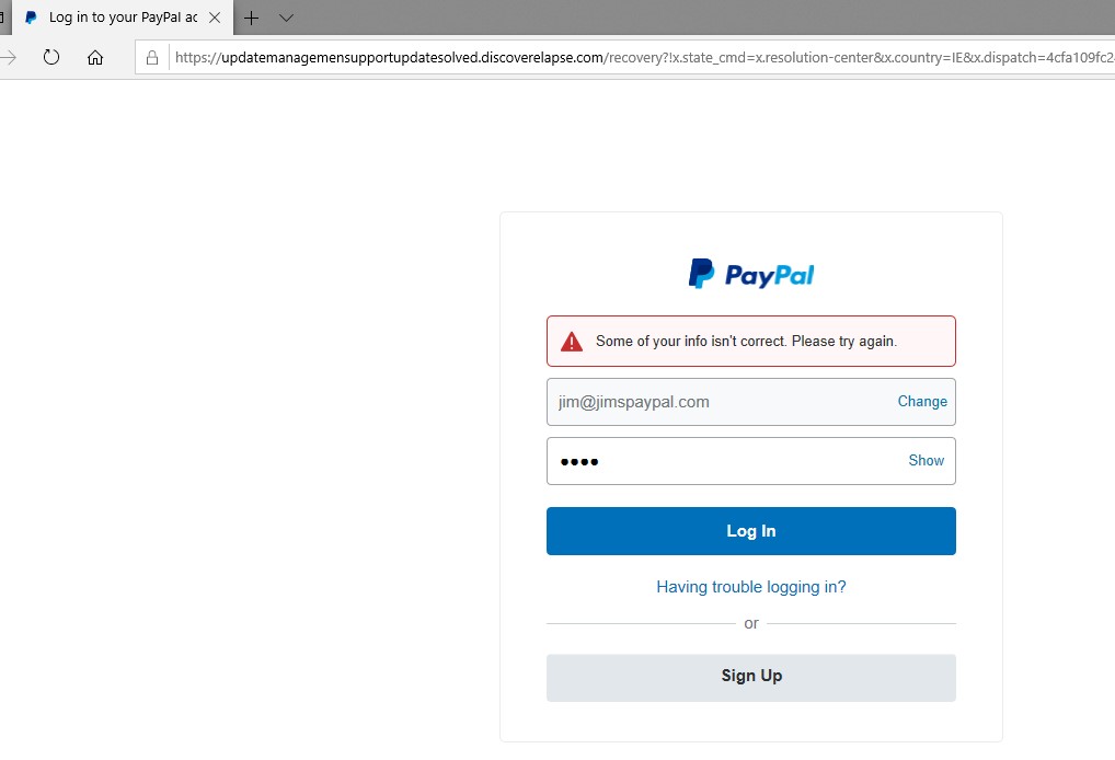 Another aspect of the sandbox analysis is that it has uncovered the potential Command & Control server. This is where the malware “phones home” and awaits instruction/sends data. Once again my curiosity got the better of me, so I’ve turned on a sandboxed PC to try the link.  It didn’t disappoint – a great fake Paypal Login page. (aside from the URL)